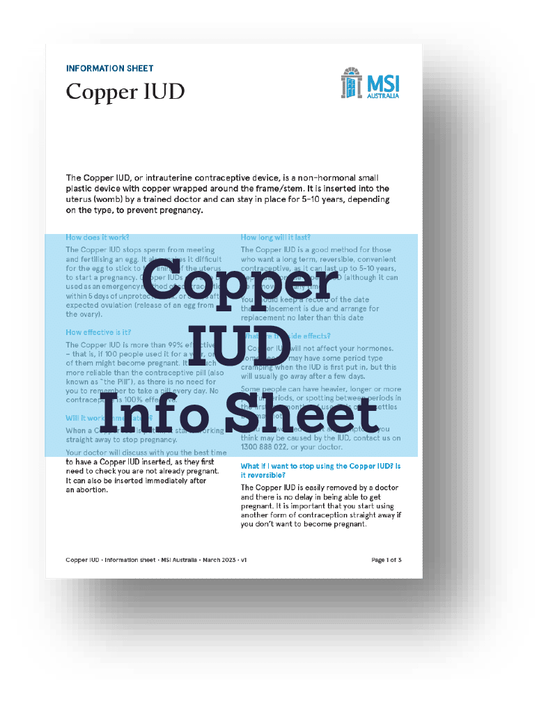 There are 3 forms of intrauterine contraception available in Australia: the copper IUD and 2 different hormonal IUDs. One hormonal IUD is slightly smaller in size and has less hormones than the other. Each of them is long-acting, reversible and effective forms of contraception that work to prevent pregnancy.